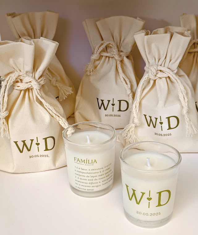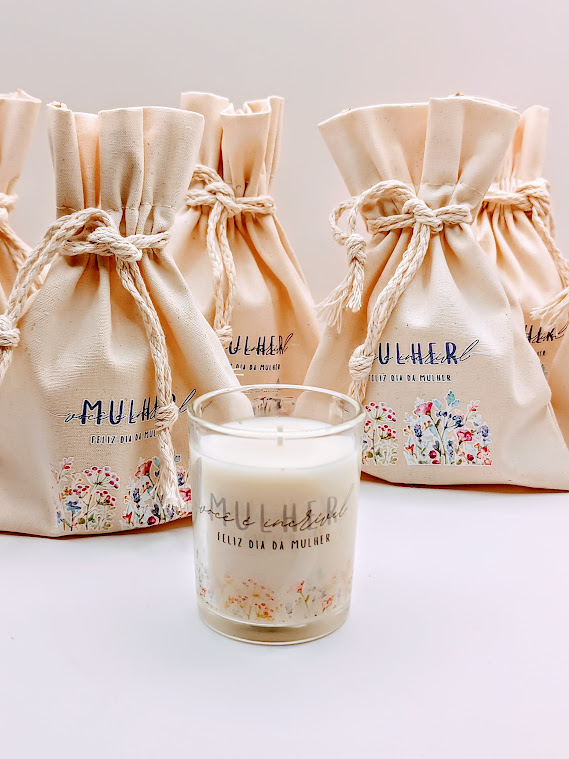 vela aromática personalizada 60g + saquinho de algodão personalizado