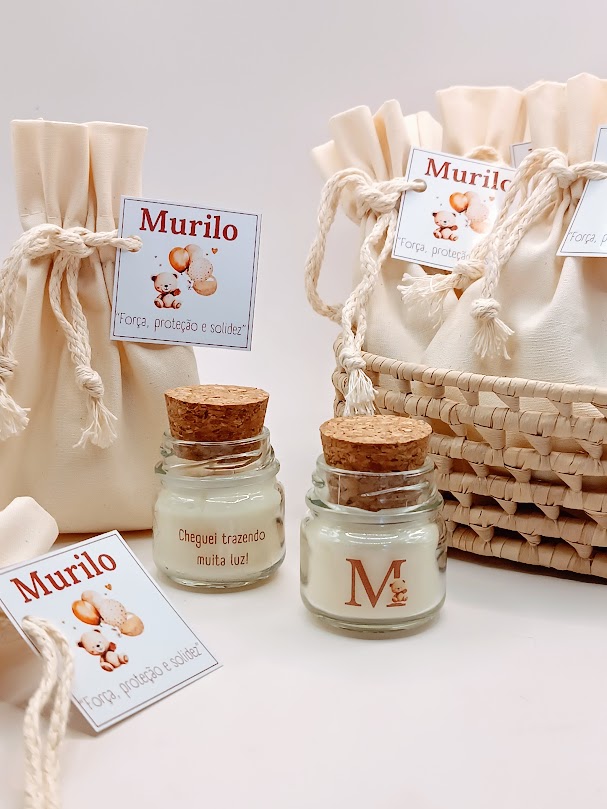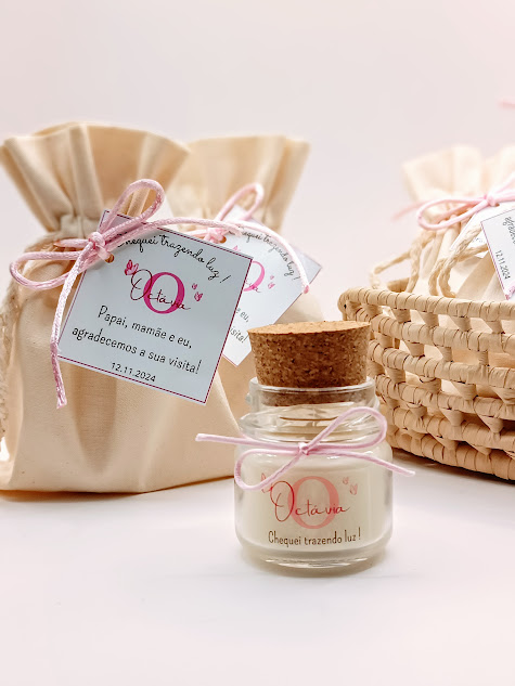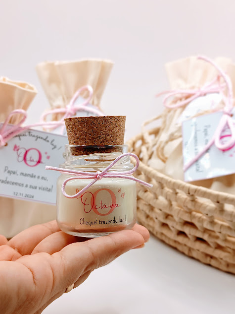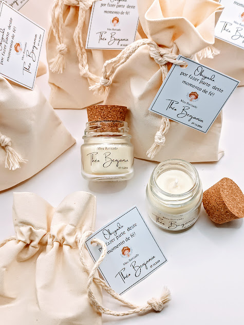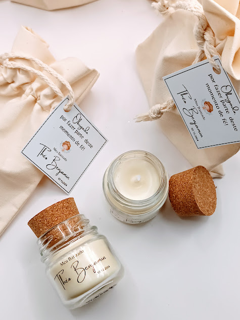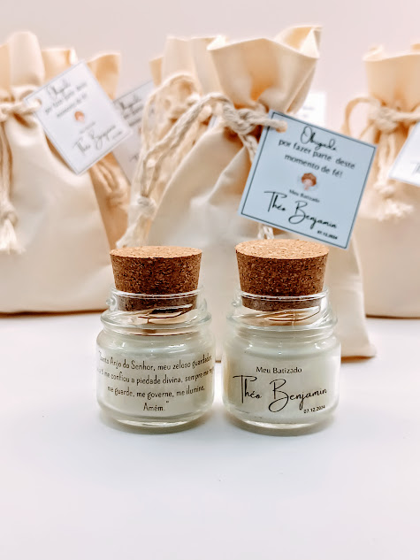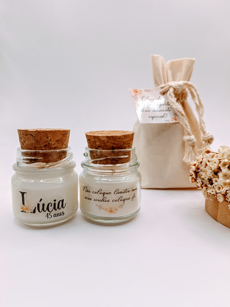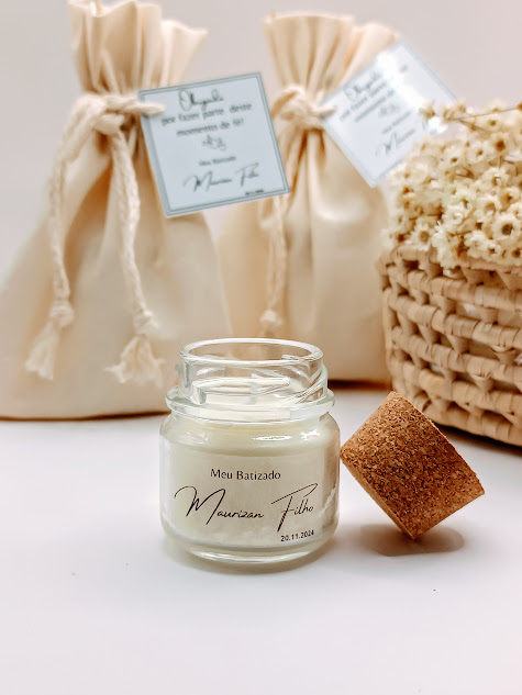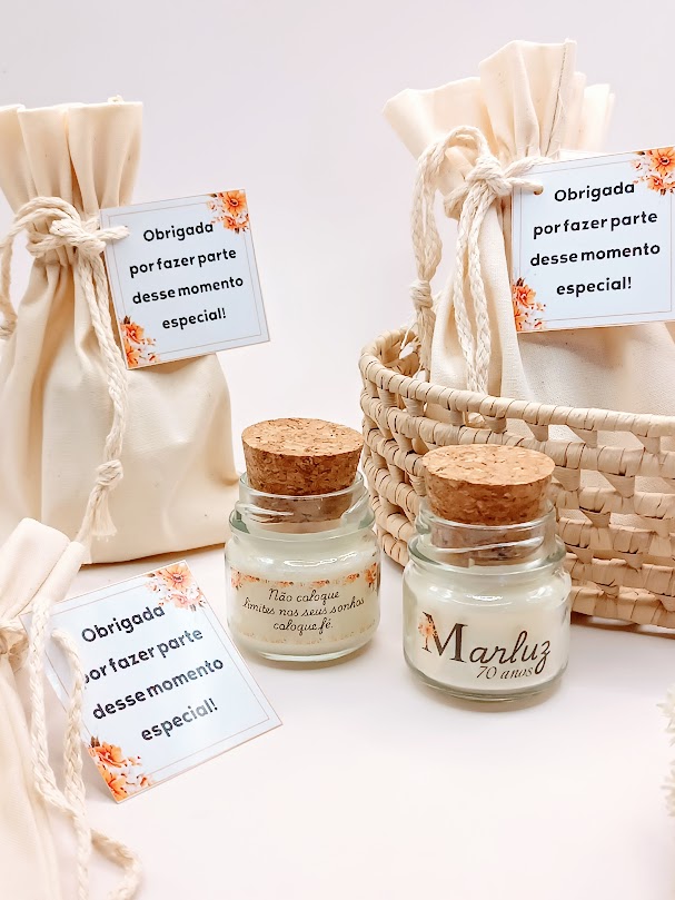 - LEMBRANCINHA VELA VIDRO 30G PERSONALIZADA + SAQUINHO DE ALGODÃO COM TAG PERSONALIZADA